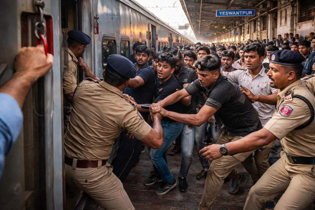 A brief spell of chaos unfolded at Yeshwantpur railway station on Monday evening after a group of passengers pulled the emergency alarm chain on a Goa-bound train and allegedly assaulted Railway Protection Force (RPF) personnel who attempted to intervene.