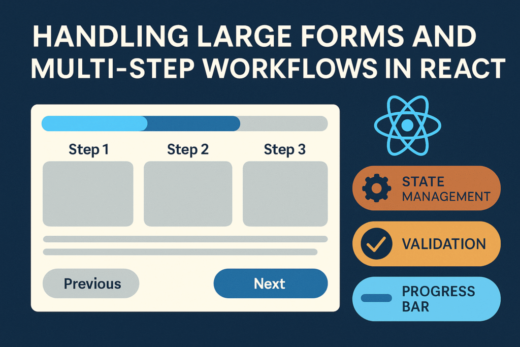 Handling large forms and multi-step workflows in React requires balancing state management, performance, and user experience. By leveraging tools like Formik or React Hook Form, implementing multi-step flows, and optimizing rendering, developers can create smooth, scalable, and user-friendly form experiences.