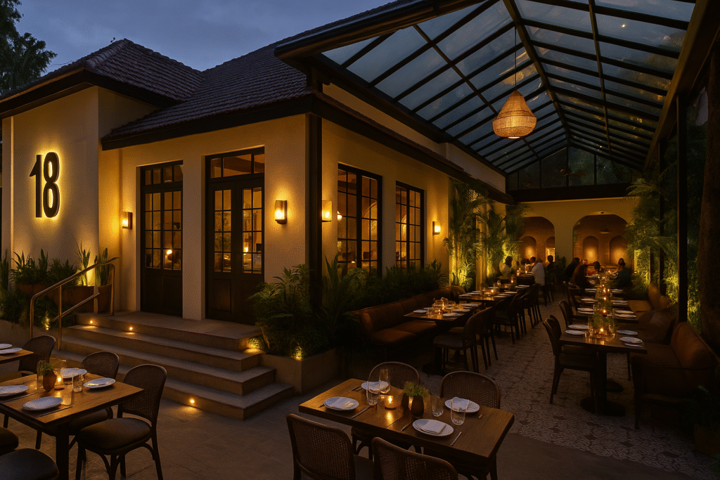 The restaurant’s interiors blend modern minimalism with vintage charm, preserving much of the bungalow’s old-world warmth. Designed with an open glass roof, One8 Commune lets in natural sunlight, creating a bright, airy vibe.