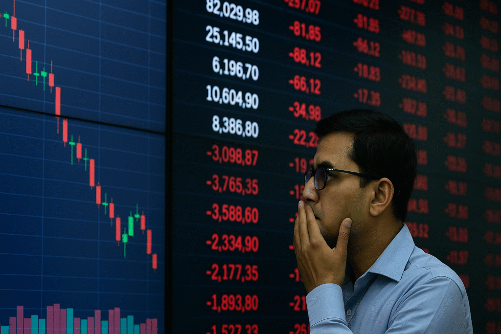 Indian equity markets ended lower on Thursday amid broad-based selling across sectors, led by losses in banking and financial heavyweights. The Nifty 50 closed below the crucial 25,200 mark, while the Sensex fell nearly 300 points, weighed down by declines in SBI, Bajaj Finance, and ICICI Bank.
