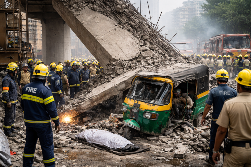 A tragic accident occurred in Mulund, northeast Mumbai, on Saturday afternoon when a portion of an under-construction Mumbai Metro rail pillar collapsed onto a busy stretch of LBS Road.