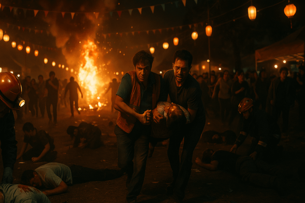 The explosions tore through the festival site, scattering debris and leaving a scene of horror. Witnesses reported seeing children among the dead.