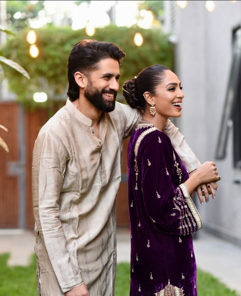 Her husband, actor Naga Chaitanya, appeared alongside her in several frames — sometimes playfully snapping pictures, sometimes holding her hand against the soft shimmer of Diwali lights. One photograph, in particular, caught fans’ attention — a silhouette of the couple holding hands amid the glow of diyas, symbolizing love and new beginnings.