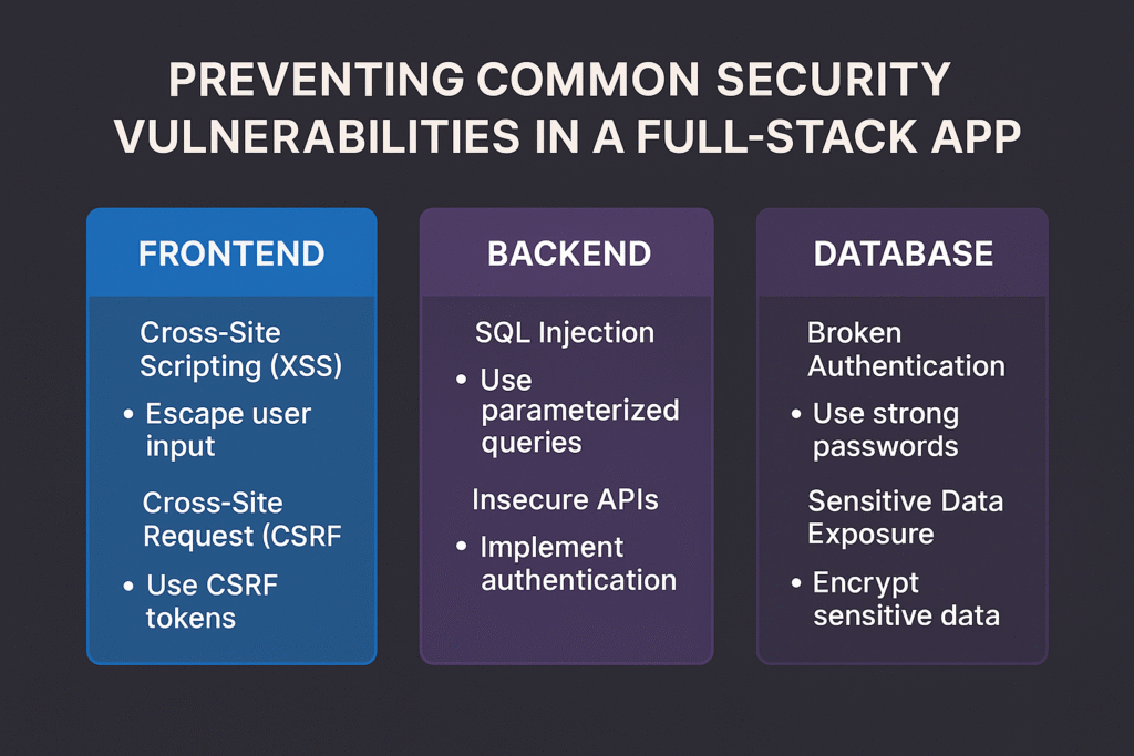 Securing a full-stack app requires attention at every layer — from frontend input validation and backend API security to database protection and infrastructure hardening.