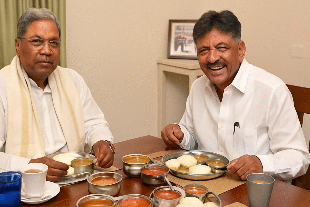 The meeting follows days of speculation, closed-door discussions, and public remarks that suggested an ongoing tussle over the Chief Minister’s post. Photos shared by both leaders — smiling across a table set with idli and sambar — quickly went viral in political circles, where the leadership issue has dominated discussion.