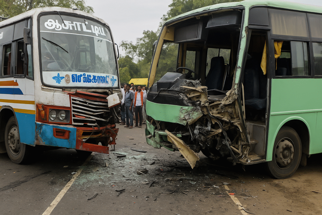 In a tragic road accident in Tamil Nadu’s Tenkasi district, six people — including a child — lost their lives and more than 50 passengers were injured when two buses collided on Monday. The impact left both vehicles heavily damaged, prompting a massive rescue and medical response.